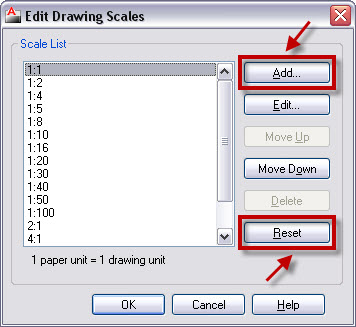 This brings up the Edit Drawing Scales dialog box where you can Add scales you need, or more importantly, Reset back to the AutoCAD default scales for either Metric or Imperial, or both.