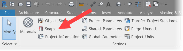 You will find your Snaps in Revit on the Manage tab on the Revit ribbon on the Settings panel.
